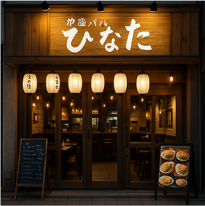 炉端バル ひなたは、旬の串焼きや一品料理を楽しめる和洋融合のカジュアル酒場です。