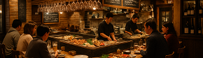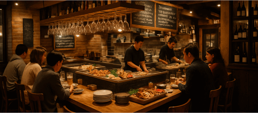 目の前で調理されるライブ感あふれる体験と、木の温もりある居心地の良い空間で、友人や恋人、一人でもゆったり過ごせる場所です。