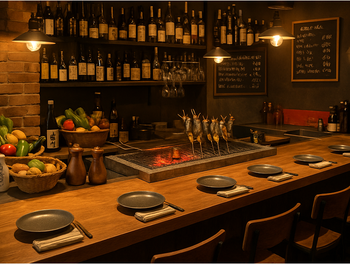 旬の食材を炭火でじっくり焼き上げ、香ばしい香りと料理に合う日本酒やワインを楽しむ